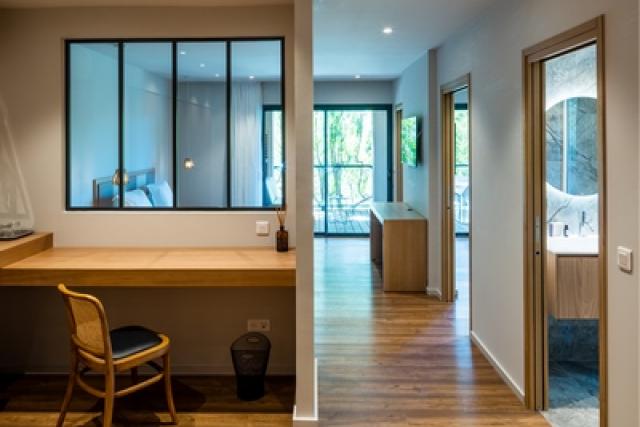 26 Ruime en moderne kamers met verfijnde inrichting en van verschillende types: dubbele kamer gelijkvloers tuinkant (26m², tuinzicht en gedeeltelijk zeezicht), kamer zeezicht met balkon (26m²), suite Confort Pinède (maximaal 4 personen, 50m² met terras), suite Vue Mer (maximaal 4 personen, 60m² met terras), suite Mariosa (maximaal 4 personen, 52m² met panoramisch terras), suite Prestige (maximaal 4 personen, in een bijgebouw op 150m van het hoofdgebouw, 200m² met verwarmd privézwembad, panoramisch terras). Allen met airco, kingsize bed (180x200cm), gedeeltelijk open badkamer met badkuip in de kamer en afgescheiden douche en WC, haardroger, satelliettelevisie, kluis, minibar en wifi.